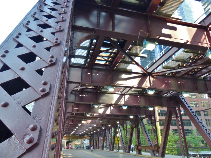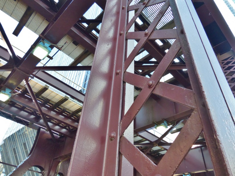 Superstructure elements include intricate X-bracing for the Warren Truss, floor beams, and lateral bracing for the train deck. 18 June 2019. Lighting elements converge in the distance in this eastbound view towards the intersection of W. Lake and W. Wacker.