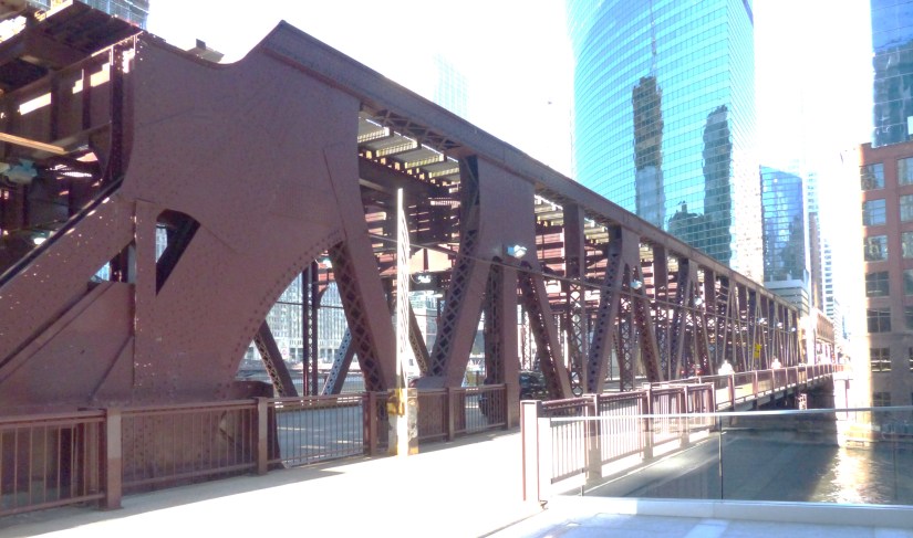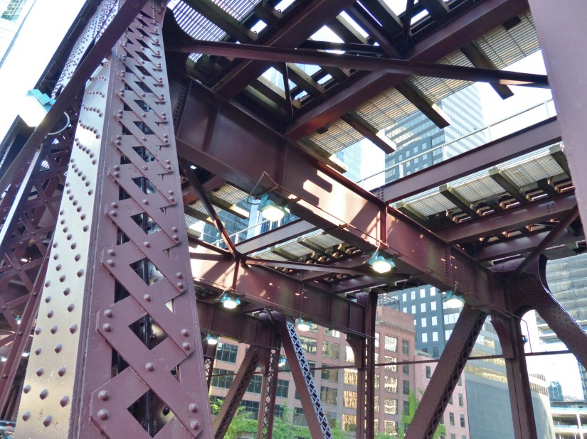 The Lake Street Bridge is a double-deck, double-leaf bridge that spans the beginning of the Chicago River’s South Branch. It is in the divided Warren Truss style. The beams form a W shape along the clear span. Structural features include wing walls, abutments, and train deck approach spans. Bridge tender’s houses serve as control centers during bridge lifts and construction projects. They are an essential aspect of public safety. Bridge date: 1916. This view was taken during an architecture cruise. Photo date: 4 May 2019. Lighting challenge: reflections from glass-faced buildings and the calm water surface.