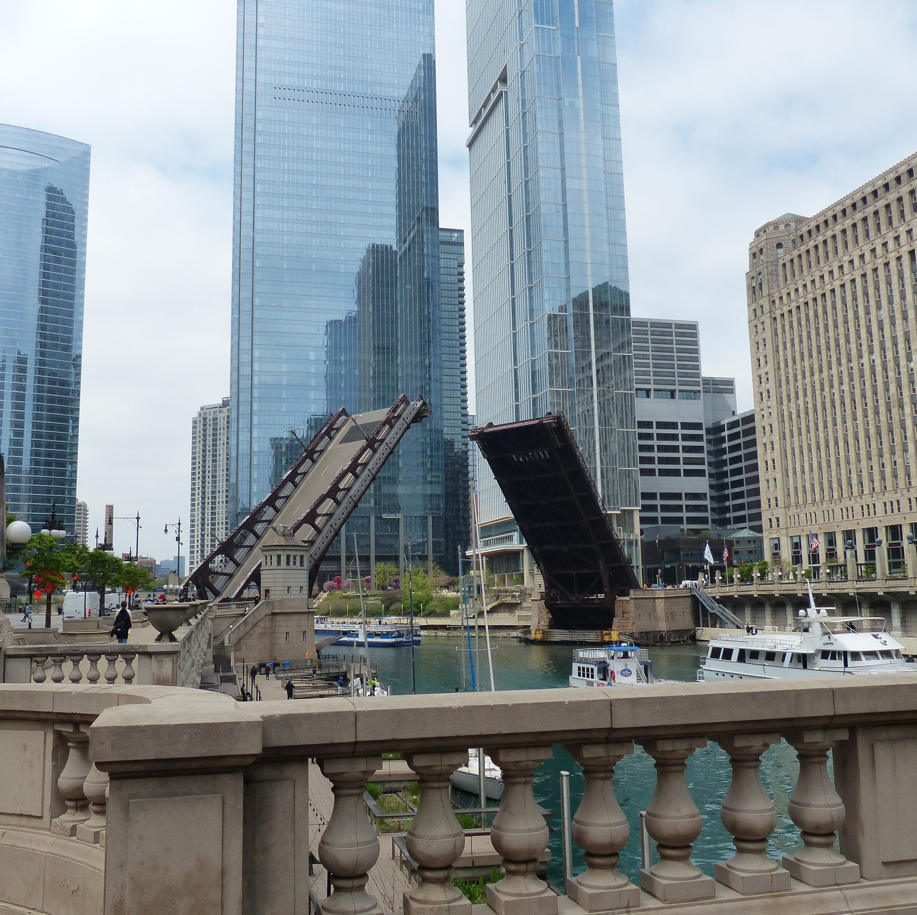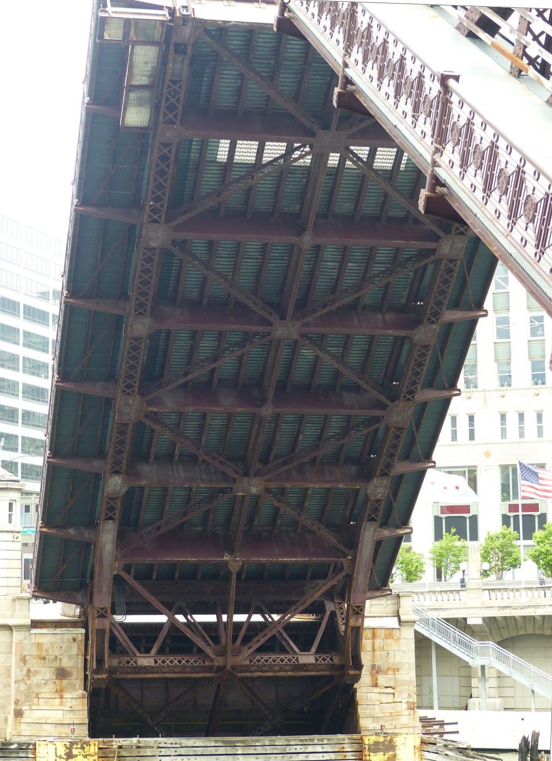 The mechanics of Chicago’s bascule bridges are displayed during the bridge lifts that occur every spring. These allow tall-mast craft to pass through the narrow clearances owing to the topography of the river.