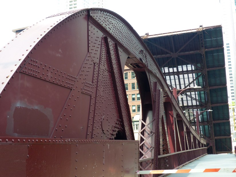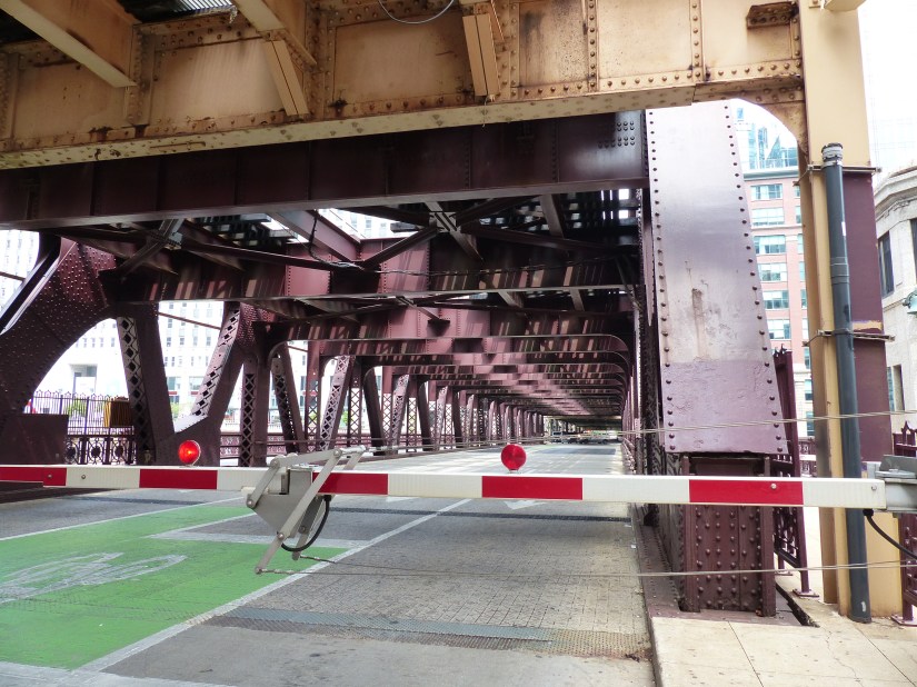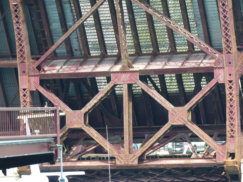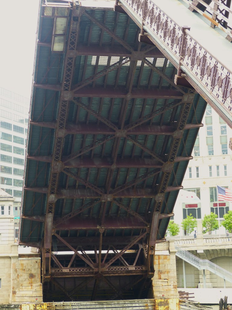 Stop lights flash and bells sound as crews prepare for the raising of Clark Street Bridge.Clark Street Bridge south leaf gear rack, gusset plates, west sidewalk, and part of a stop light mast. View looks north.The north leaf rises on Clark Street Bridge. Design elements: Pratt pony truss, X-bracing, part of the southeast corner gear rack protection plates. View looks north.Clark Street Bridge north leaf raised and southeast corner gear rack with gusset plates and rivets. View looks north.North leaf of Clark Street Bridge showing substructure elements of bracing, sidewalk cantilevers, and abutment. View northwest includes the corner bridge tender’s house.Telephoto of north leaf substructure. Clark Street Bridge.North leaf substructure elements, abutment, bridge protection bumper, and northwest bridge house.