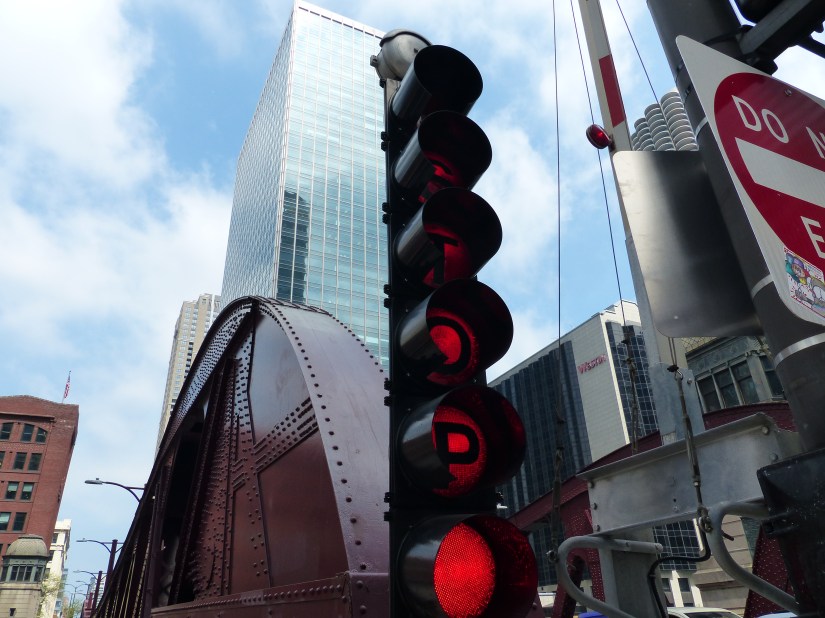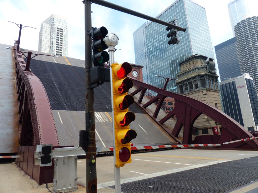 LaSalle Street Bridge before the lift. Four bridge tender’s houses stand out against the background of Chicago’s architecture. Background: Reid-Murdoch Building and Marina City. Also noted are 300 North LaSalle, The Westin River North, 321 North Clark, 353 North Clark, and in the distance at right, the slender spire of Mather Tower.Beginning of the LaSalle Street bridge lift. The south leaf rises.LaSalle Street bridge center. Telephoto.LaSalle Street Bridge with both leaves rising. View looks north.LaSalle Street Bridge south leaf with stop lights, lowered gate arms, bell, and SE bridge house.LaSalle Street Bridge with both leaves raised. View looks northwest.