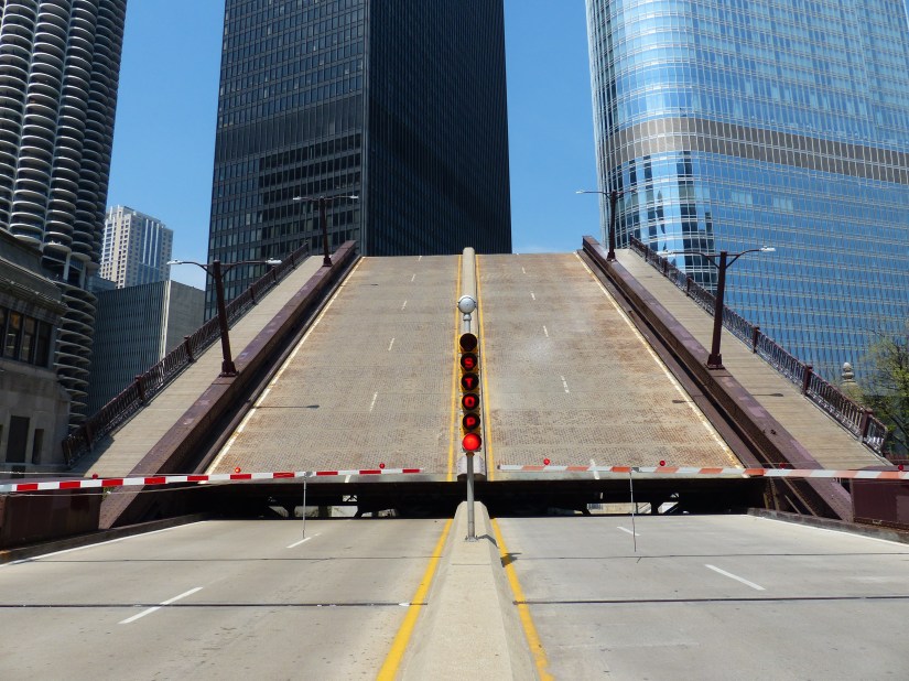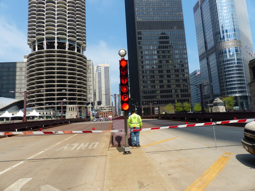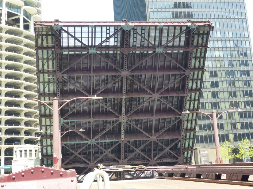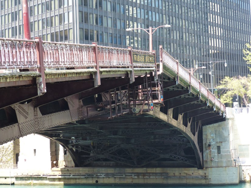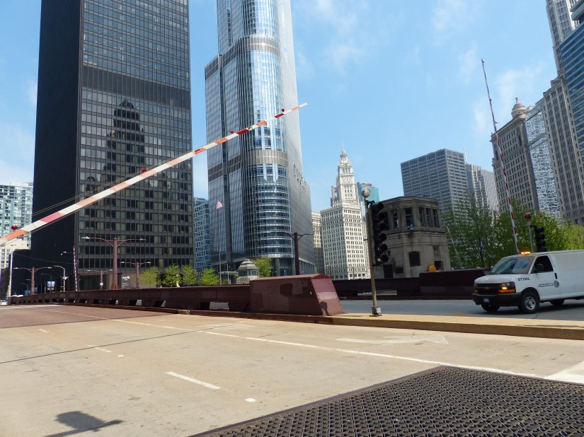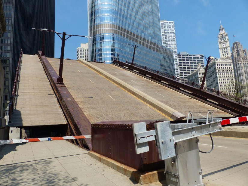 The bridge viewed looking north along Wacker Drive. Buildings nearby: Tribute Tower at right, and Wrigley Building at left. The bridge is a double-leaf, double-deck, Chicago style fixed trunnion bascule in the Pratt deck truss design.The bridge has a clearance of 16 feet below it. The layout of the Chicago River made necessary the clear span design and movable spans to allow passage of watercraft too tall to go underneath if it stayed in the lowered position. Here the structural elements of the Pratt deck truss are shown near the bridge’s center. Also shown are sidewalk railings for both decks, marine lights, bridge signs, and gusset plates. Focal length: 102 mm at 35mm equivalent. The south leaf begins to rise. At right is the entire aspect of the northeast bridge house, from foundation to rooftop near where that portion of the Riverwalk begins.The center of the north leaf is exposed with its sidewalks, railings, truss panel points, and abutment.Telephoto of the raised south leaf. Background structures: Wrigley Building, River Plaza, and the R 444 North Michigan. Focal length: 54mmTelephoto of the exposed center of the north leaf. Crew members watch near its edge as part of the team effort for public safety. Focal length: 86mmThe south leaf lowers as crews ensure the locking mechanisms are properly oriented. This concludes that day’s photographic record. Telephoto length: 133 mm.