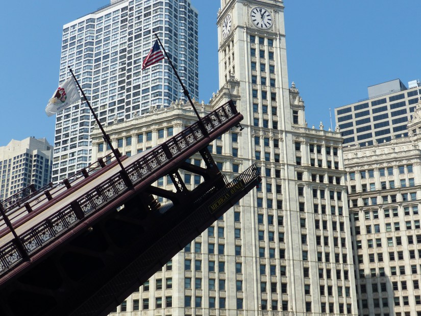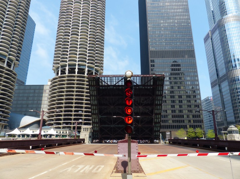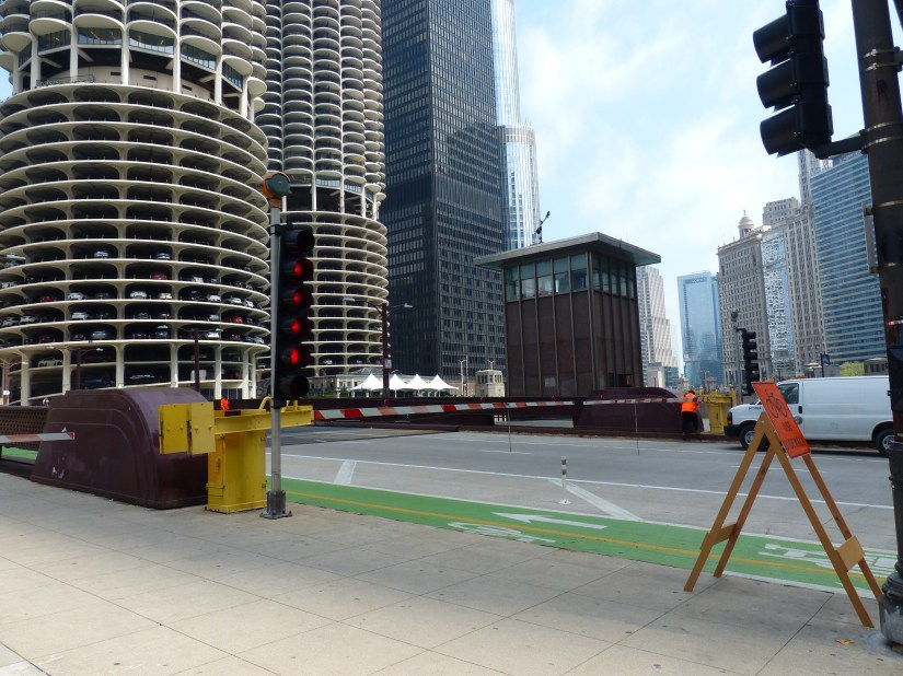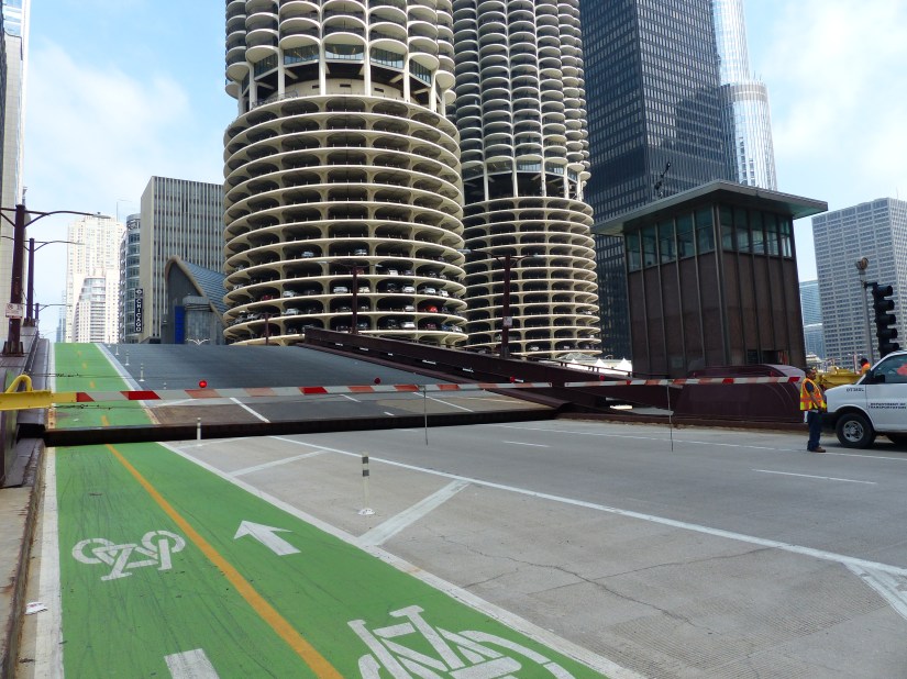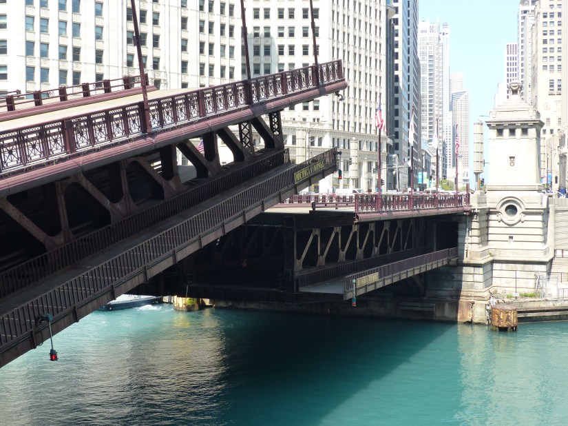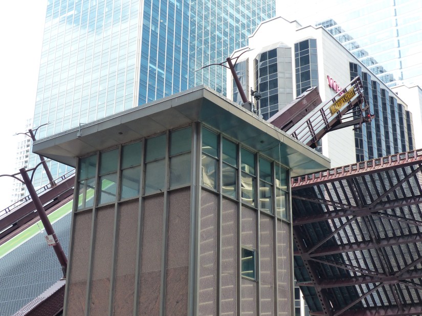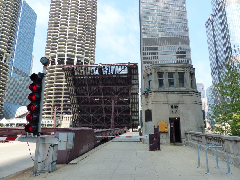 The bridge viewed looking north along Wacker Drive. Buildings nearby: Tribute Tower at right, and Wrigley Building at left. The bridge is a double-leaf, double-deck, Chicago style fixed trunnion bascule in the Pratt deck truss design.The bridge has a clearance of 16 feet below it. The layout of the Chicago River made necessary the clear span design and movable spans to allow passage of watercraft too tall to go underneath if it stayed in the lowered position. Here the structural elements of the Pratt deck truss are shown near the bridge’s center. Also shown are sidewalk railings for both decks, marine lights, bridge signs, and gusset plates. Focal length: 102 mm at 35mm equivalent. The south leaf begins to rise. At right is the entire aspect of the northeast bridge house, from foundation to rooftop near where that portion of the Riverwalk begins.The center of the north leaf is exposed with its sidewalks, railings, truss panel points, and abutment.Telephoto of the raised south leaf. Background structures: Wrigley Building, River Plaza, and the R 444 North Michigan. Focal length: 54mmTelephoto of the exposed center of the north leaf. Crew members watch near its edge as part of the team effort for public safety. Focal length: 86mmThe south leaf lowers as crews ensure the locking mechanisms are properly oriented. This concludes that day’s photographic record. Telephoto length: 133 mm.