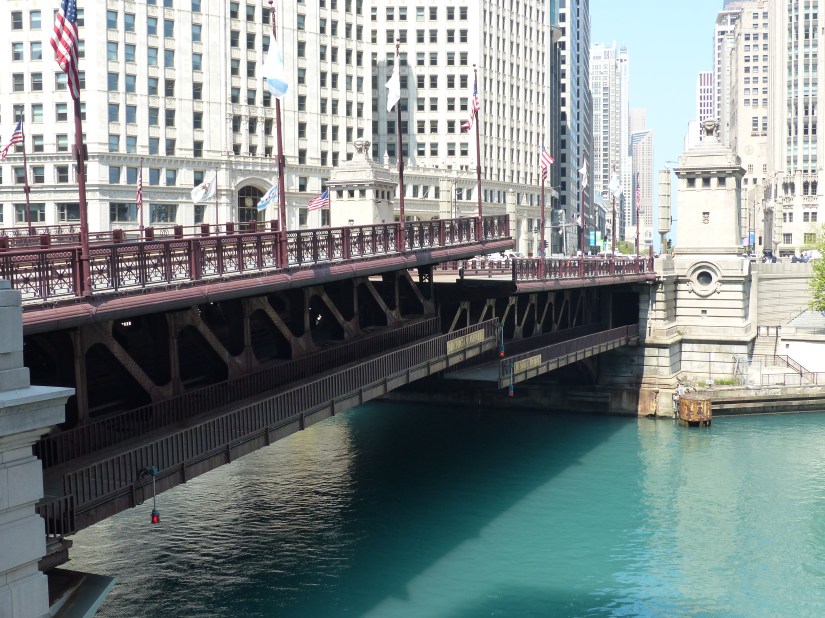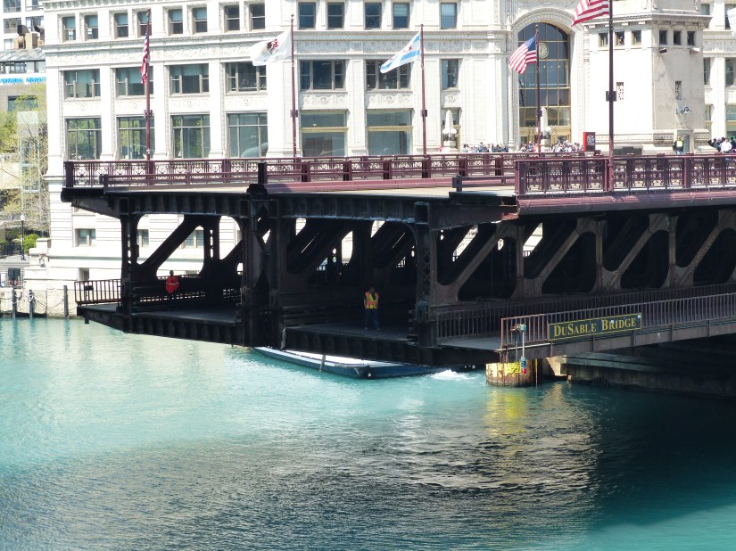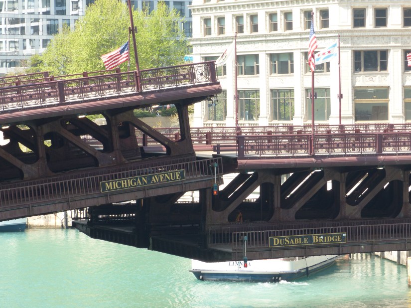 DuSable Bridge at North Michigan Avenue. Date: 1920. Design era: Structural style: Chicago-style fixed trunnion double-deck, double-leaf bascule. Carries: North Michigan Avenue over the Main Branch of the Chicago River. Named in honor of Jean Baptiste Pointe DuSable, the city’s first non-native resident, who had a homestead on land northeast of the present bridge.