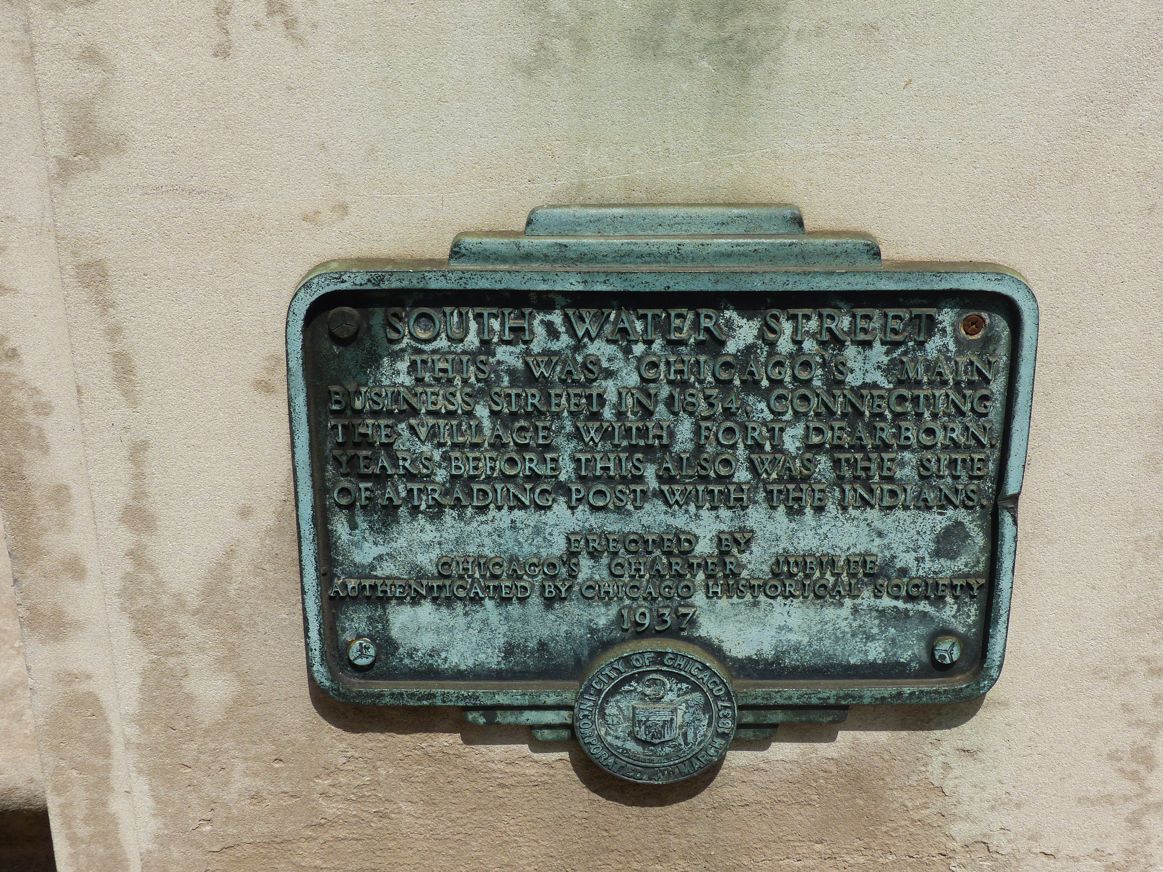 The clear span of Dearborn Street Bridge before the day’s bridge lift. At right is the bridge tender’s house, which keeps to a Mid-century, streamlined style appropriate for the bridge. Bridge style: double- leaf, single deck, deck-truss, Chicago style fixed-trunnion bascule. The design principles are minimal use of ornament, exposed structural engineering logic, and lighter leaves than the nearby ornate bridges of the 1920s.Dearborn Street Bridge viewed looking north. In the foreground is a housing for the south leaf’s trunnion mechanisms. A wing wall extends away from the north leaf across the river. Buildings in the area: Marina City, House of Blues, The Westin River North, 330 North Wabash, Museum of Broadcast Communications, and the Kinzie Hotel.Gate arms are lowered at the north leaf as crews prepare to elevate the leaves. Substructure elements visible include gusset plates, sidewalk cantilevers, and part of the abutment.Stop lights flash and bells sing as the gates are lowered at the south leaf. Bridge crews are ready in their public safety roles in the house and around the bridge at both leaves. The view looks east.The south leaf begins to rise. The view looks north-northeast.The south leaf rises, showing markings on the road deck. The east sidewalk is shown along with its gate arm.Both leaves are up as sailboats and larger boats pass under them. The view looks north and northwest. The bridge tender’s house displays its minimalist aesthetic as the foundation descends to anchor at the Riverwalk. Substructures are shown on the north leaf, including the abutment and pit for the counterweights. View is from the sidewalk along Wacker Drive. Buildings in the area: Marina City, The Westin River North, Reid-Murdoch Building, 321 North Clark, 353 North Clark, and 300 North LaSalle.The bridge tender’s house and the center point of the bridge’s leaves as they near maximum height for that day’s lift. The substructure of the north leaf displays stringers, floor beams, truss point bracing and gusset plates, and sidewalk cantilevers. Focal length: 54mm.Placed near the Dearborn Street Bridge, this plaque recalls the days when South Water Street was the main business street in 1834. The inscription reads: “This was Chicago’s main business street in 1834, connecting the village with Fort Dearborn. Years before, this was also the site of a trading post with the Indians. Erected by Chicago’s Charter Jubilee. Authenticated by Chicago Historical Society. 1937.”
