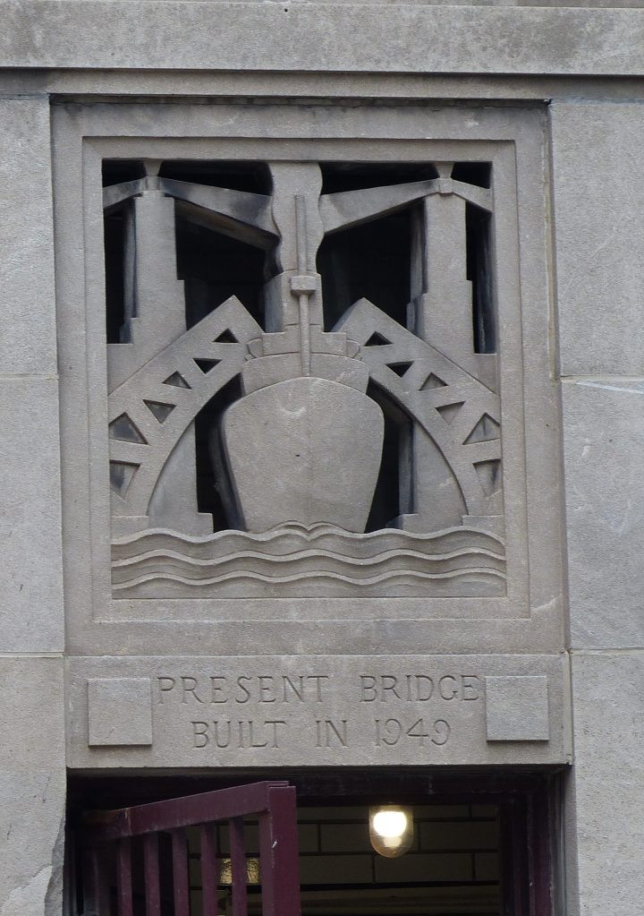 Bridge crews are ready as the gate arms lower at the south leaf. Buildings in the area include: 330 North Wabash, Wrigley Building, 401 North Michigan Avenue, 401 North Wabash Avenue, Club Quarters, Royal Sonesta, and London House, with the cupola of the original structure above the modern row at the right.Crews are ready for the bridge lift. Safety features: crew members around the bridge and in the tender’s house, flashing stop lights, warning bells, and gate arms, plus the life ring on the bridge house. View looks north.Carving of a raised bascule bridge and passing ship on gently rolling waves above the main entrance to the southeast corner bridge tender’s house. It shows the 1949 date of the building of the present bridge. The carving also shows lighthouses or building beacons and smoke rising from the ship.Warning lights and bell mast, lowered gate arms, and a watchful crew member at the south leaf wait for the lift. The view looks north from the raised median.The north leaf rises, exposing elements of the substructure. These include stringers, floor beams, and sidewalk cantilevers. The bridge’s design is a Pratt deck truss with the railing height truss variation, wherein most of the leaf members are below the road deck. The heavier, ornate bridges of the 1920s nearby display gigantic, curved gear racks with huge gusset plates and a higher Pratt pony truss variation. The view looks north.More of the north leaf’s substructure is shown as the leaf continues to rise. The view looks north and includes the northwest corner bridge house. Elements include sidewalk cantilevers, stringers, truss points with gusset plates, and floor beams. A centered view north from the median shows the flashing stop lights, lowered gate arms and elements of the leaf’s substructure. Buildings in the view include Marina City, 330 North Wabash, and the House of Blues.The raised north leaf and exposed substructure elements, warning lights and bell, and southeast bridge house with its bell and life ring. Bells on bridge tender’s houses are a traditional part of the public safety network. The view looks north along the east elevation sidewalk.The substructure of the north leaf at its maximum height is shown here. This includes the abutment and counterweight pit, and the northwest bridge house from rooftop to foundation.