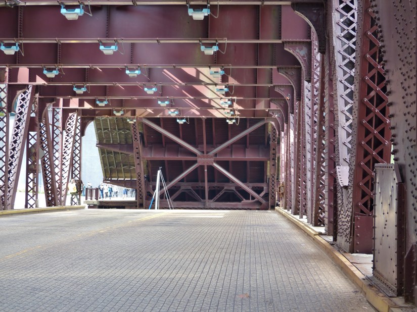 During this boat run, the west leaf of the Lake Street Bridge lifted high enough to expose a rare, comprehensive view of the floor system, truss connections, and superstructure bracing. The southeast‑corner vantage point provides a clean, diagonal look under the leaf, while the telephoto focal length compresses the structural grid into a readable, engineering‑useful frame.