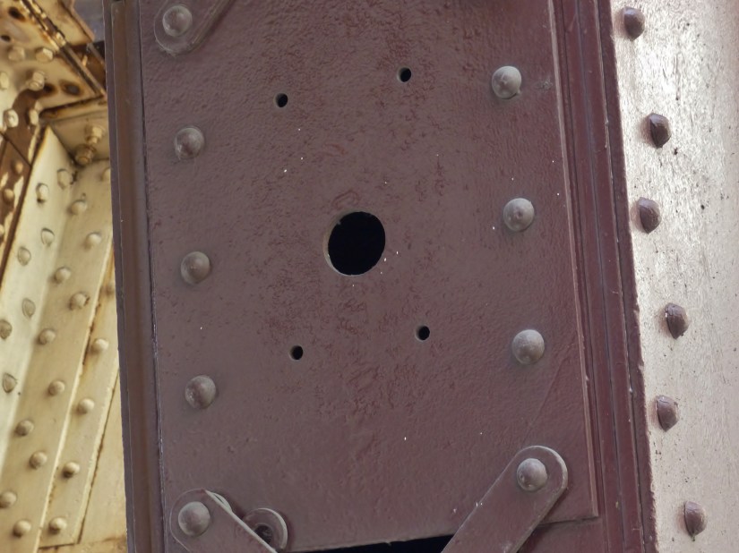 On the Wells Street Bridge, these are often seen in vertical and diagonal members of the truss, where multiple steel shapes are riveted side-by-side. The plates prevent buckling or lateral displacement of these elements under compressive loads.