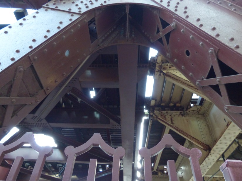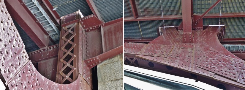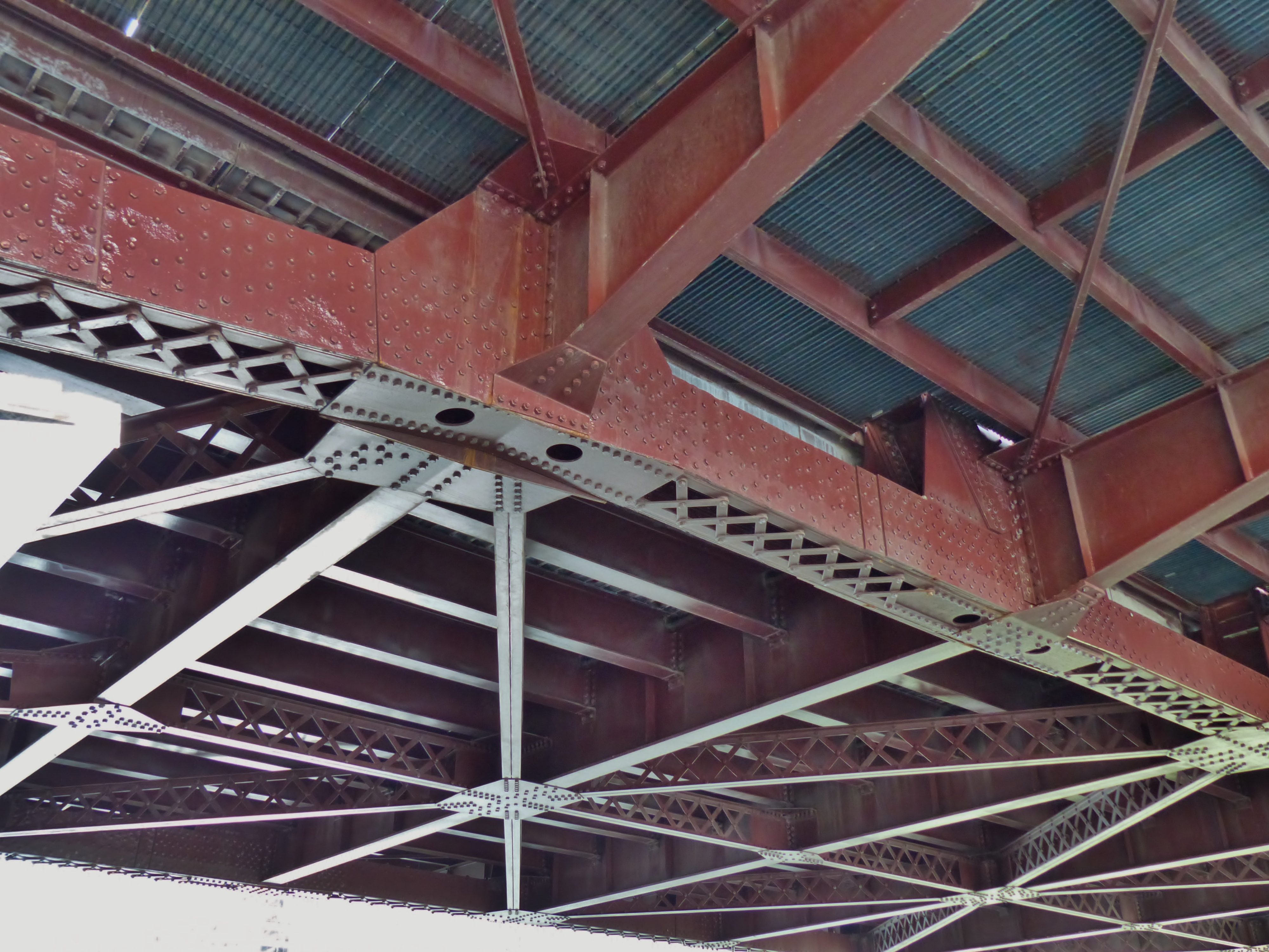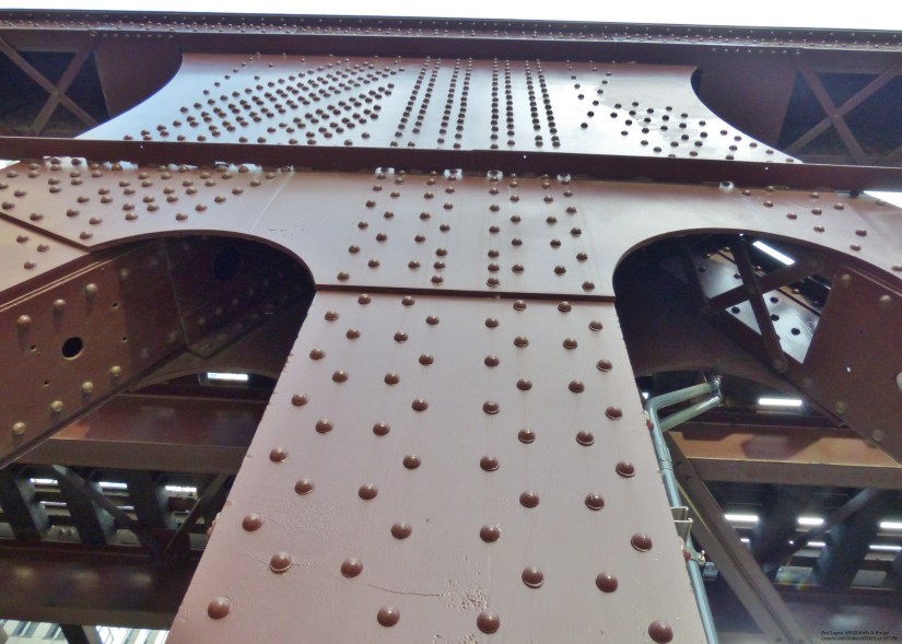 Through the axis of the bridge during bridge lifts or from sidewalks, bottom chord connections are notable in the parallel bracing and gusset plates at the nodes towards the clear span portion of the superstructure.