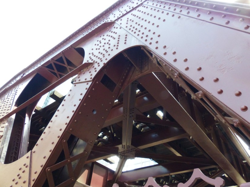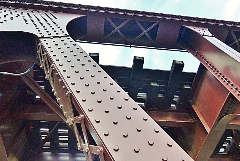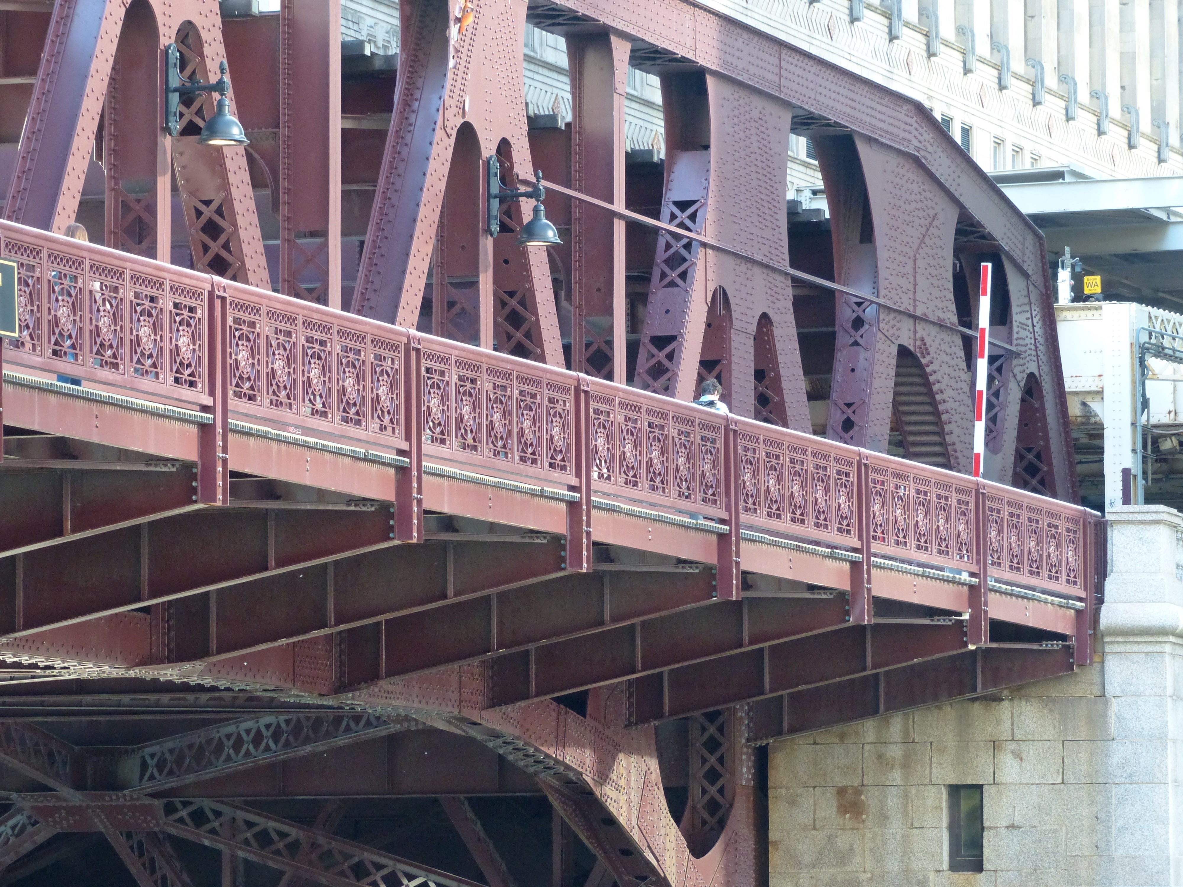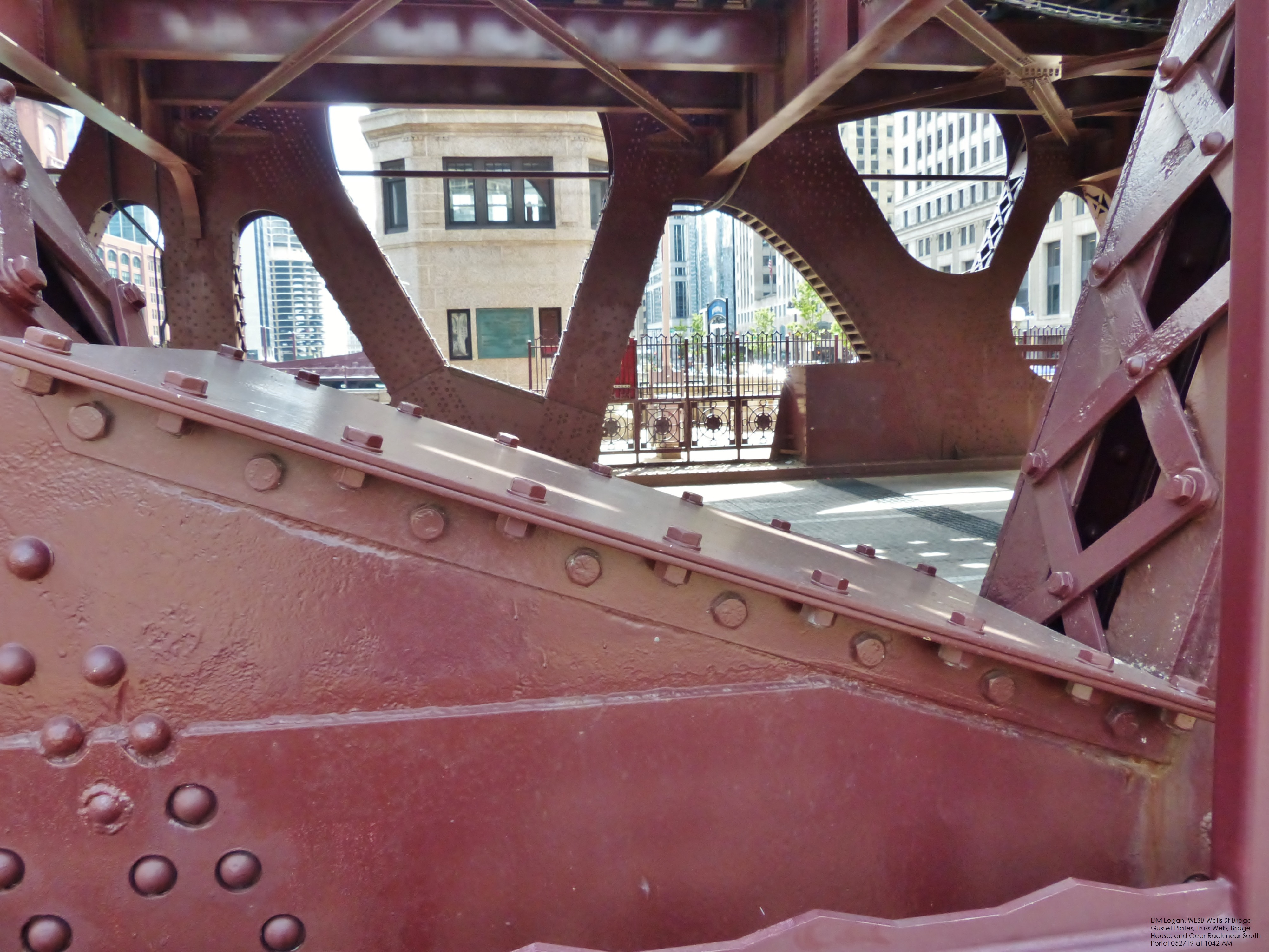 While primarily functional, batten plates contribute to the visual rhythm of the bridge’s steel work, anchoring the geometry of the truss with regular intervals. Their presence reinforces the bridge’s identity as a machine aesthetic civic structure, where form follows function but also narrates Chicago’s industrial legacy.