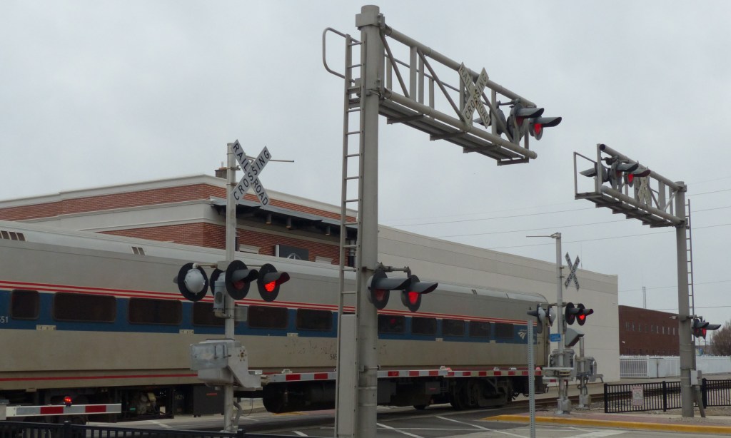 An important point to remember is that when all these components are present, the system is classified as an active traffic control device at a highway-rail grade crossing. The steeple of the Memorial Building is in the lower left corner. This historic structure was built in 1927.
